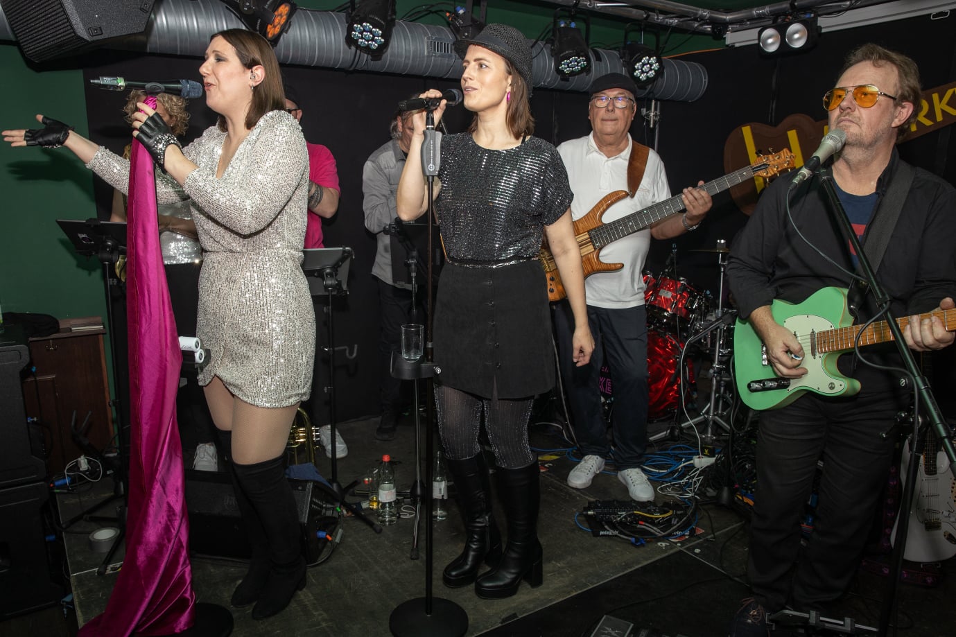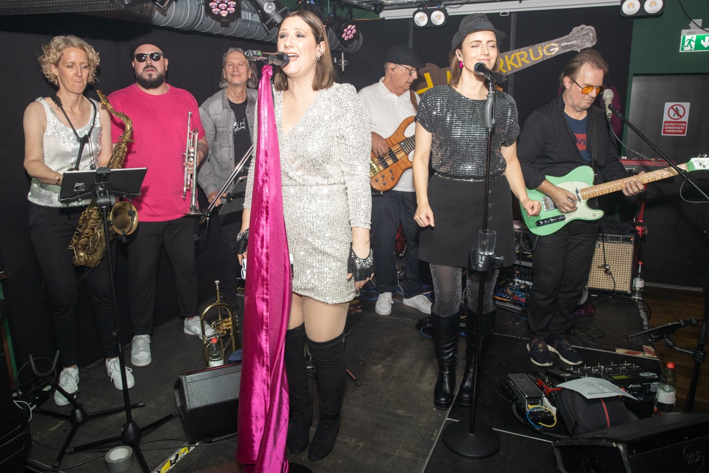 Die zwei stimmgewaltigen Sängerinnen „MissKiss“ Alina und Johanna heben die Zuhörer in andere Sphären. Immer perfekt eingespielt: die Rhythmus-Groove-Maschine. On top: die knackige Bläsersection aus Saxophon, Trompete und Posaune.