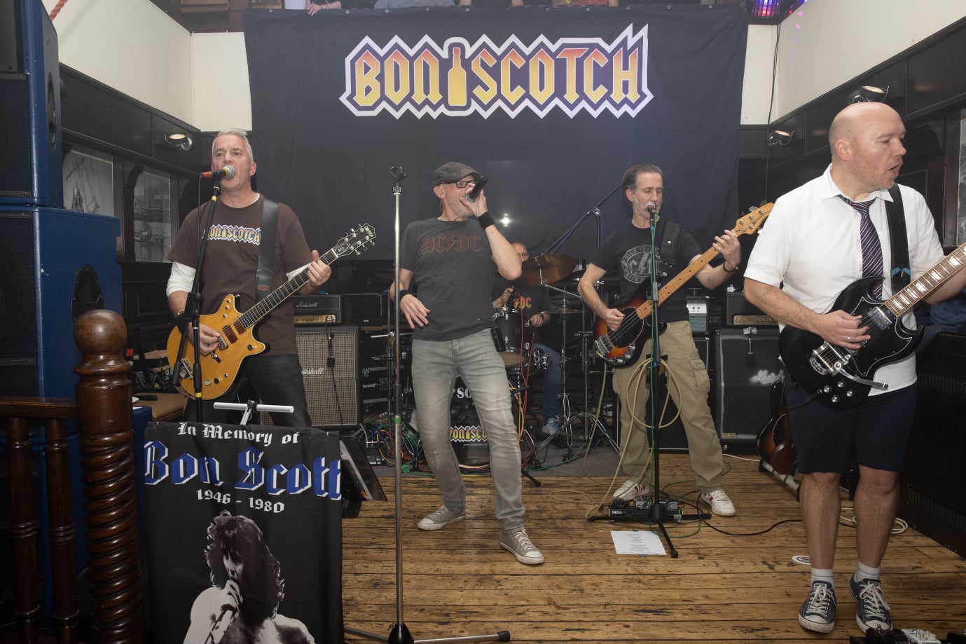 Sir schreiben das Jahr 1973 – Die Watergate-Affäre erschüttert das Weiße Haus, Borussia Mönchengladbach wird zum 2. Mal Pokalsieger und die Brüder Angus und Malcom Young gründen die Band AC/DC...37 Jahre, unzählige Hits und über 200 Millionen verkaufte Tonträger später finden sich 5 Starkstrom-Junkies Ende 2010 zusammen und gründen die Band BonScotch, um ihren Idolen zu huldigen.