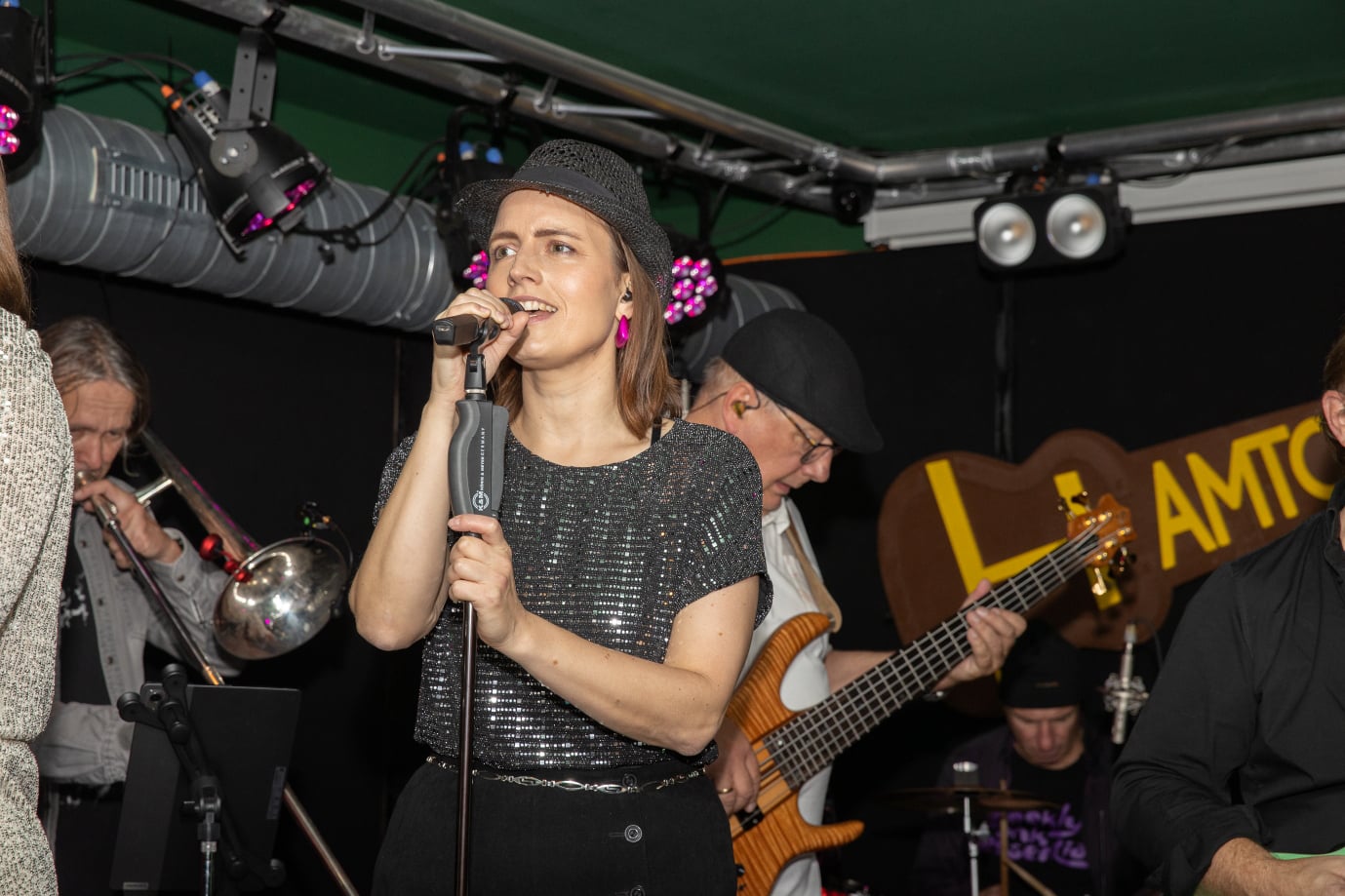 Die zwei stimmgewaltigen Sängerinnen „MissKiss“ Alina und Johanna heben die Zuhörer in andere Sphären. Immer perfekt eingespielt: die Rhythmus-Groove-Maschine. On top: die knackige Bläsersection aus Saxophon, Trompete und Posaune.