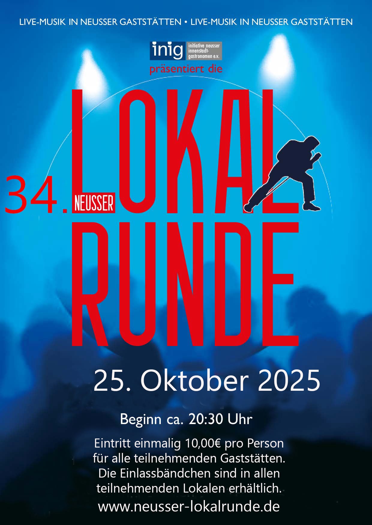 Die nächste Neusser Lokalrunde findet im Herbst 2025 statt - einfach vormerken 25.10.25. Gute Musik und Freunde treffen, das ist die Neusser Lokalrunde. Die Frühjahrsrunde 2026 ist am 28.03.